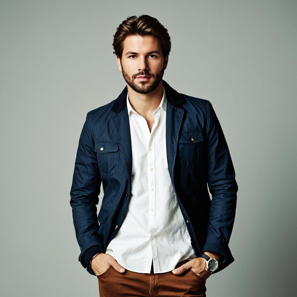 Portrait of a young man with brown hair and facial hair wearing a white shirt under a navy blue jacket paired with brown pants. He stands with hands in pockets against a plain gray background, looking directly at the viewer. He accessorizes with a wristwatch, presenting a stylish and confident smart casual look.