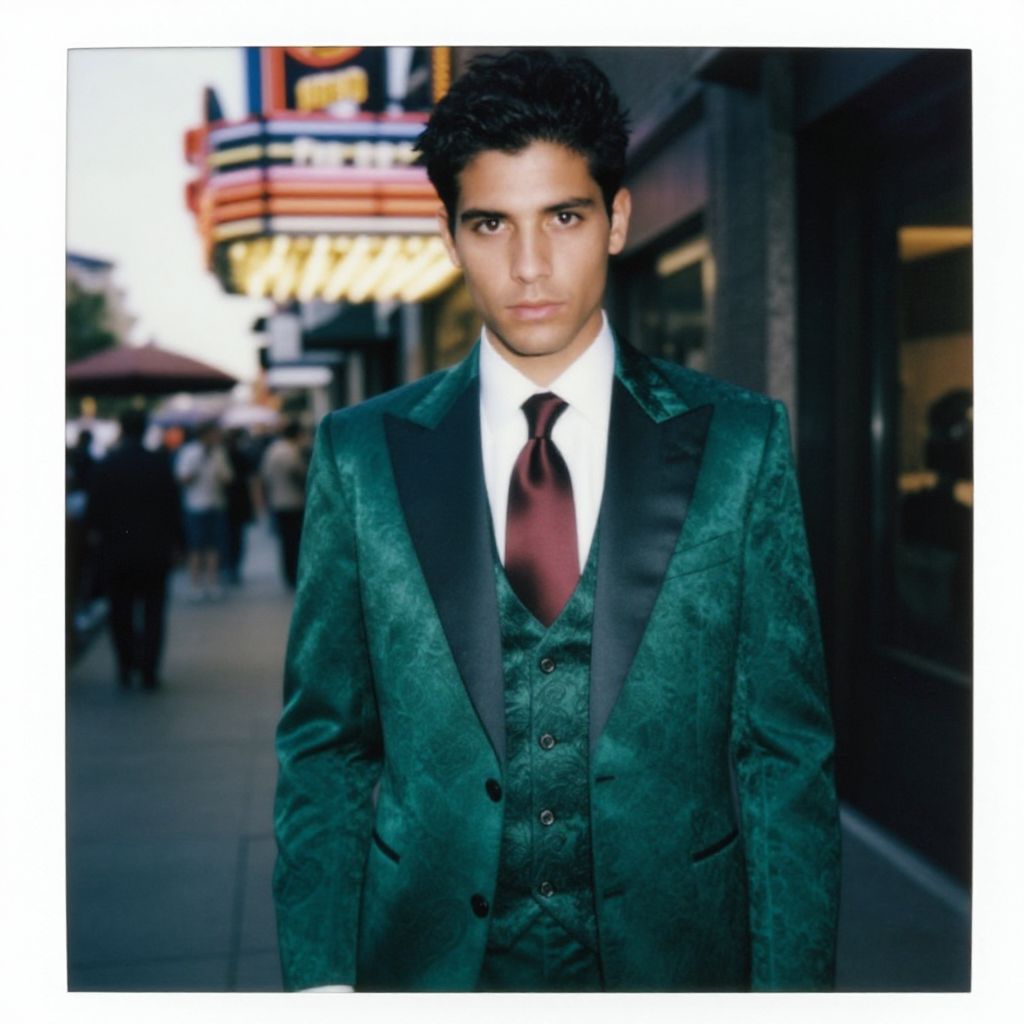 A man, couture formal paisley suit, rich emerald green silk, tailored fit, matching paisley waistcoat, crisp white dress shirt, deep burgundy silk tie, retro marquee, neon lights, bustling sidewalk, polaroid instant camera style, confident expression. Man has masculine face and piercing eyes