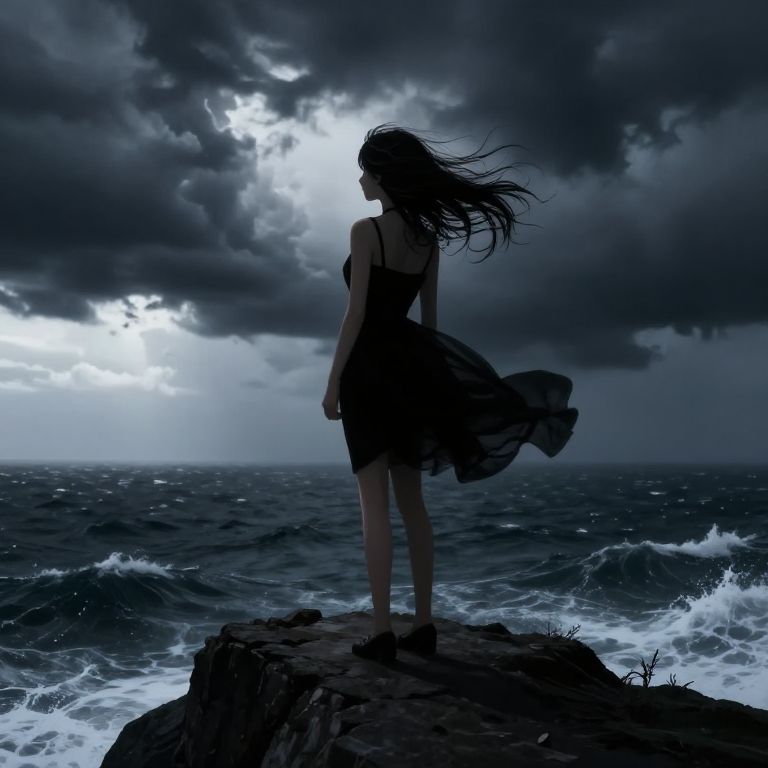 Silhouetted woman in a flowing dress stands on a rocky cliff, wind blowing, dark stormy sky, turbulent ocean waves. Digital art.