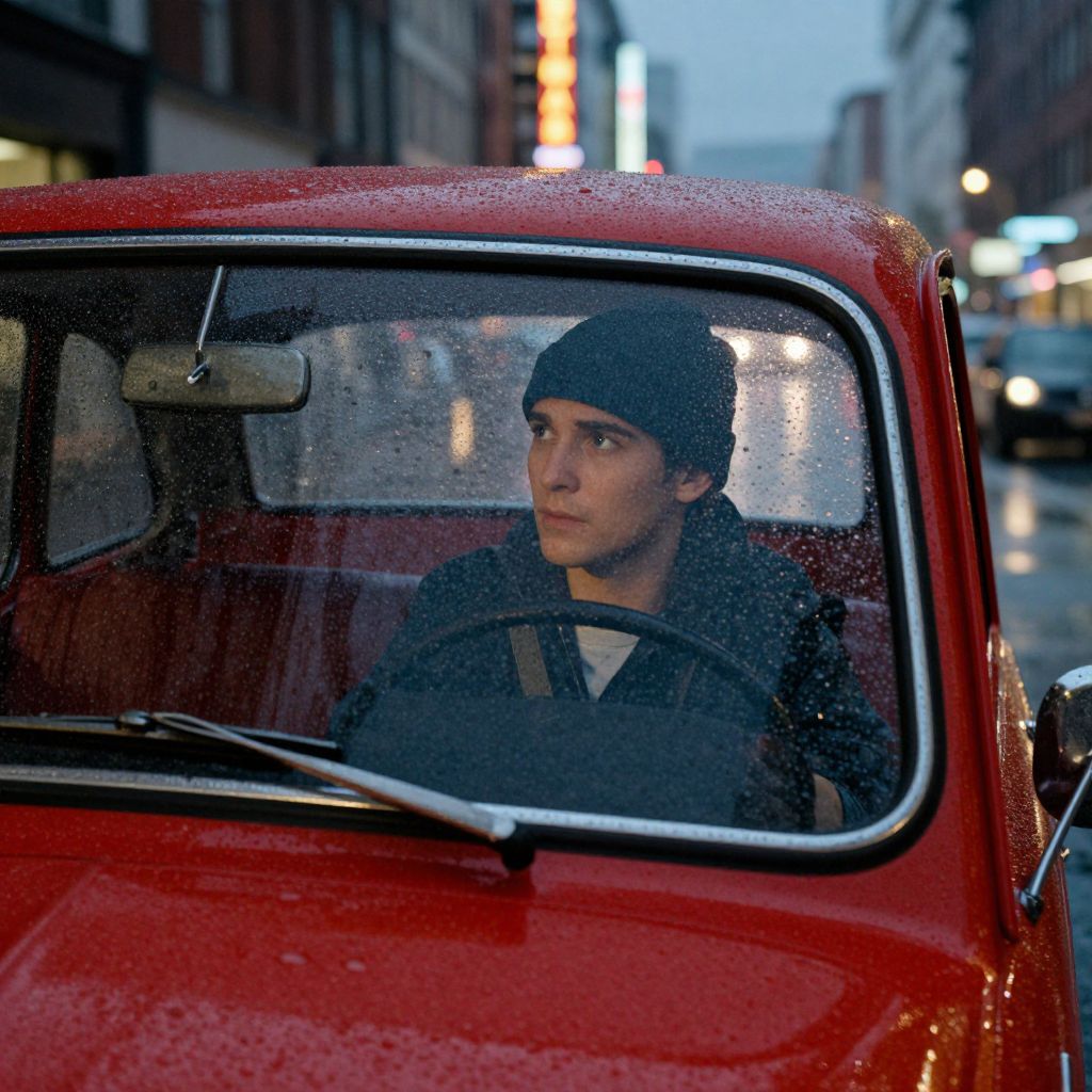 A radio playing softly in a rainy city street scene, visible through the rain-wet windshield of a vintage red car, a young man with a thoughtful expression and a beanie looking out at the scene, neon signs glowing in the wet night sky