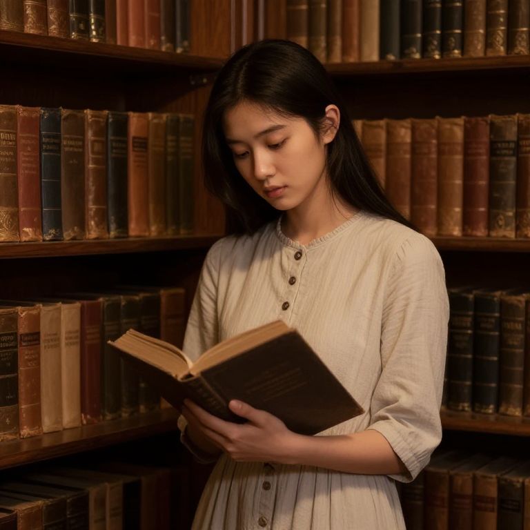 Photograph of an Asian woman with long black hair, wearing a cream-colored, long-sleeved, button-down dress, standing in a dimly lit library. She is holding an open book in front of her, looking down at it with a focused expression. The background features tall wooden bookshelves filled with variously colored, thick, old books, adding a warm, scholarly ambiance. The lighting highlights her serene face and the texture of her dress, while the book's pages are slightly yellowed, suggesting age. The overall mood is quiet and contemplative.