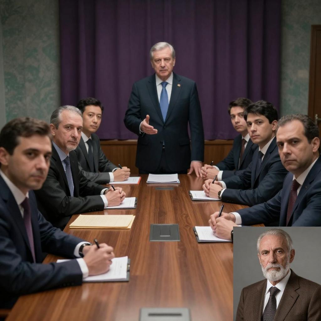 Photograph of a boardroom scene with eight men in suits seated around a wooden table. One man stands at the head, gesturing. Background includes purple curtains and green wallpaper. A smaller portrait of an older man in a brown suit is in the bottom right corner. Intense expressions on some men's faces.