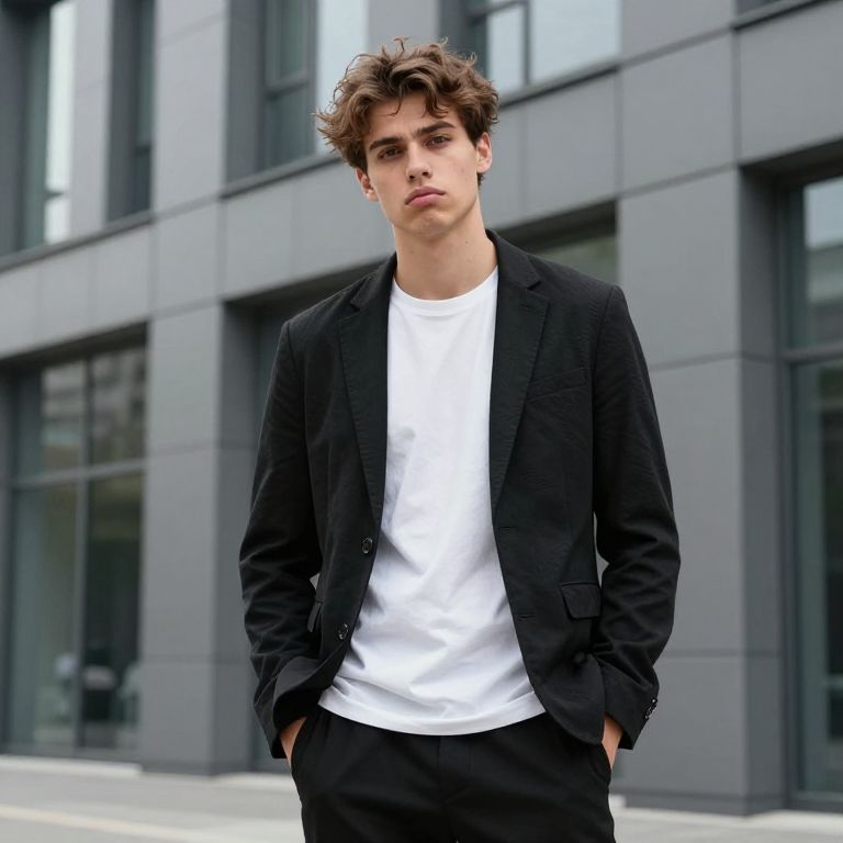 Photograph of a young, white male with tousled brown hair, standing in front of a modern, gray building. He's wearing a black textured blazer over a plain white t-shirt and black pants, with his hands casually in his pockets. He has a serious, slightly pouty expression on his face. The background features large windows and sleek architectural lines.