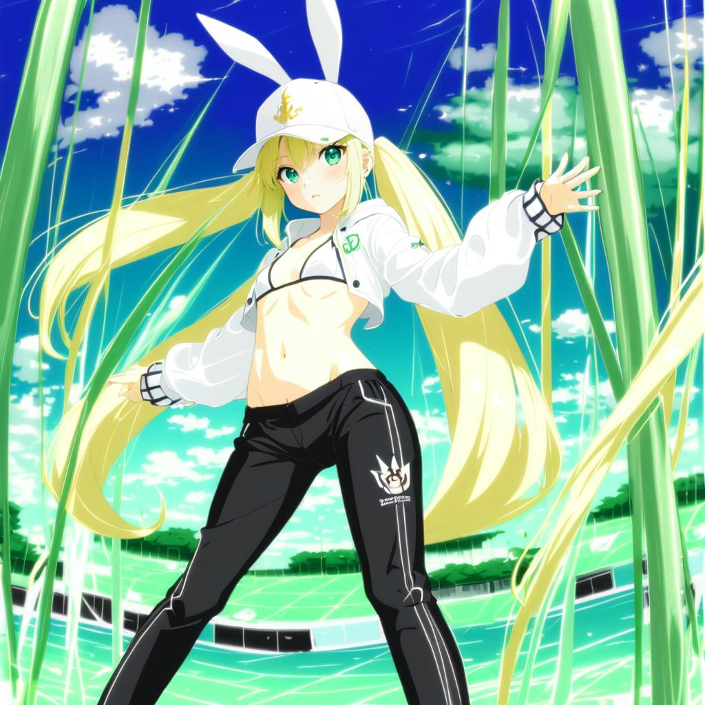 Artoria caster (swimsuit) (first ascension) (fate), fate (series), 1girl, green eyes, blonde hair, long hair, twintails, medium breasts, small breasts, thighs, navel, white bikini, baseball cap, white jacket, shrug (clothing), white headwear, cropped jacket, black pants, long sleeves, single pantsleg, white hat, by artist nyororiso (muyaa), anime