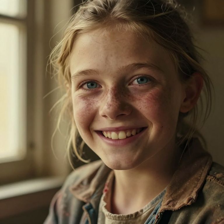 Envision a close-up hyperrealistic portrait of a cheerful girl with a battered yet wise appearance, featuring unfocused blue eyes and rugged features. Captured from a unique downward angle, his intense gaze reflects a lifetime of adventures as it connects with the viewer's eye. Framed by warm golden light from a nearby window, the scene evokes nostalgia and longing while showcasing intricate details on her lined face and worn seafaring attire. This emotional gradient transports the audience into the depths of her storied past.