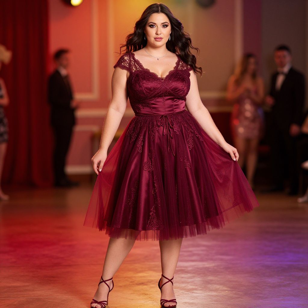 Photograph of a plus-sized woman with fair skin and black hair styled in an updo, wearing a dark green, sleeveless, V-neck, lace-embellished dress with crisscross straps and a flared skirt. She has red lipstick and is wearing black strappy high-heeled sandals. She stands confidently in front of a Christmas tree adorned with white and gold lights and ornaments, set in an elegant, warmly lit room with white columns and gold decor. Her dress flows gracefully as she slightly lifts the skirt with her hands.