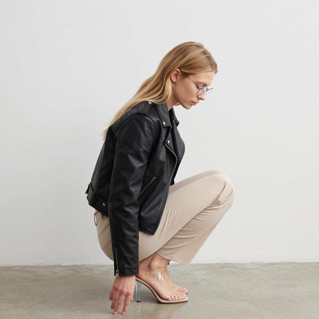 Photograph of a blonde woman bending over, adjusting her white sneaker. She wears a black leather jacket, black leather pants, and a gray shirt. Long hair falls to the right. Background includes a gray, ribbed metal wall and a tiled sidewalk. Rails are visible at the bottom. She is in the center of the image.