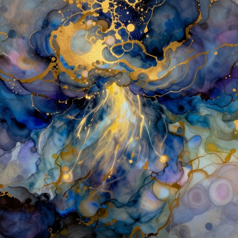 A vibrant, glowing Pointillism and Alcohol ink painting featuring a storm approaching, with metallic ink and ethereal colors, resembling a wallpaper.