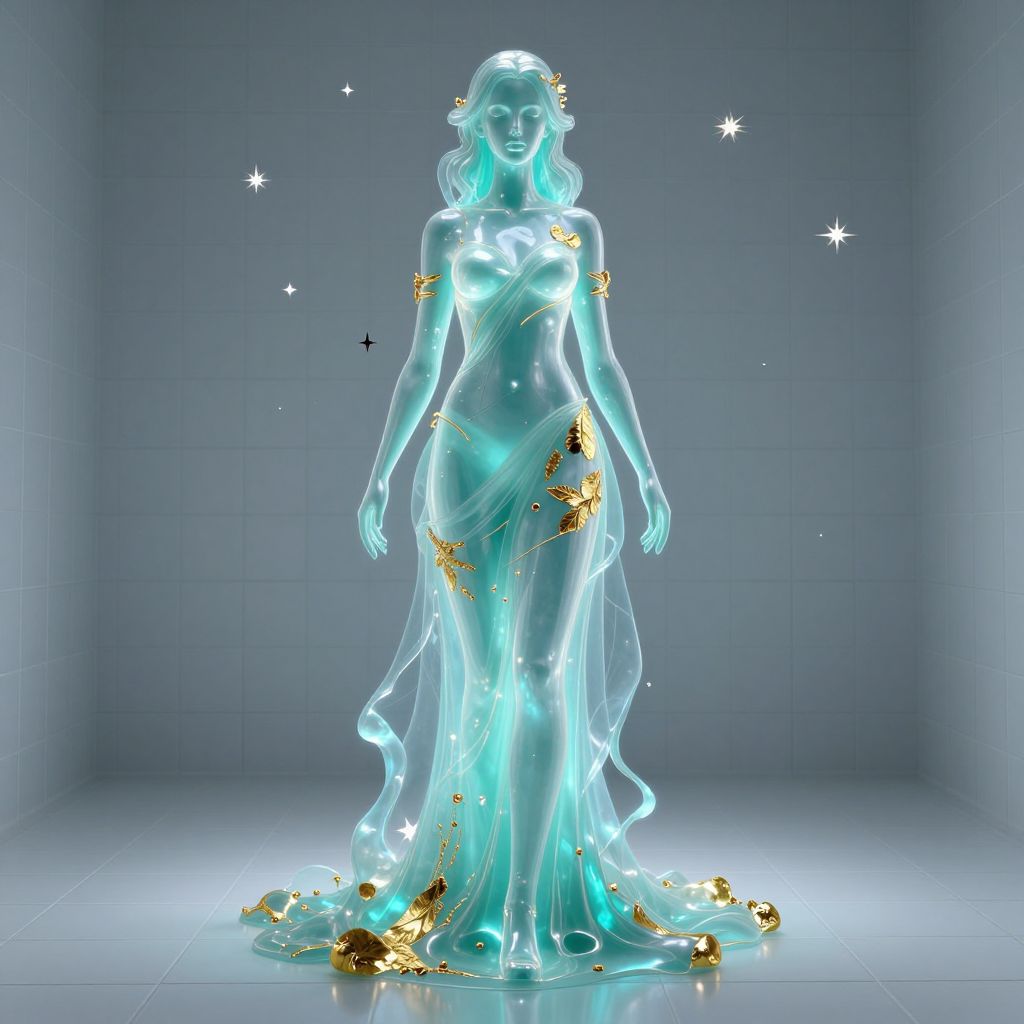 An ethereal, translucent turquoise figure of a woman made of fluid, glowing from within, with gold leaf accents, standing in a white tile room with stars in the background, created using a 32k octane render in Unreal Engine, 8k, UHD.