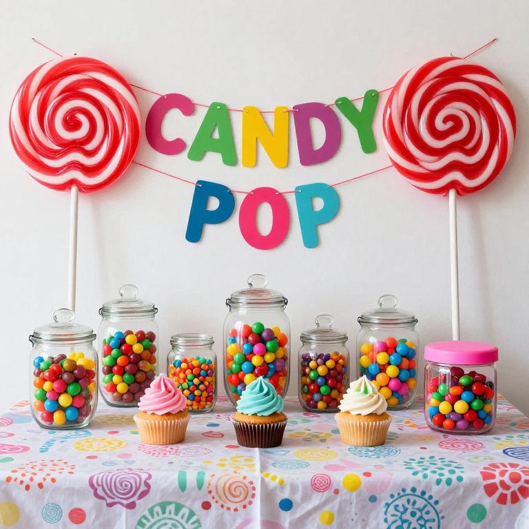 Vibrant candy-themed party setup featuring two oversized red-and-white lollipops flanking a colorful banner spelling \"CANDY POP,\" accompanied by seven glass jars filled with assorted gumballs, three cupcakes with colorful frosting, and a pink container of candies, all arranged on a table covered with a patterned tablecloth.