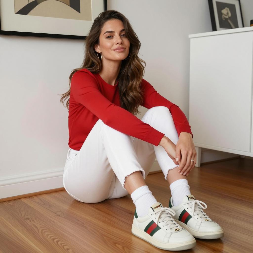Woman squatting on outdoor basketball court. Long brown hair, tan skin, smiling. Wearing blue zip-up sweater, white socks, white sneakers with green and orange accents. Green chain-link fence in background, trees and mountain in distance. Image number 12 in top right corner. Sunlight casting shadows.