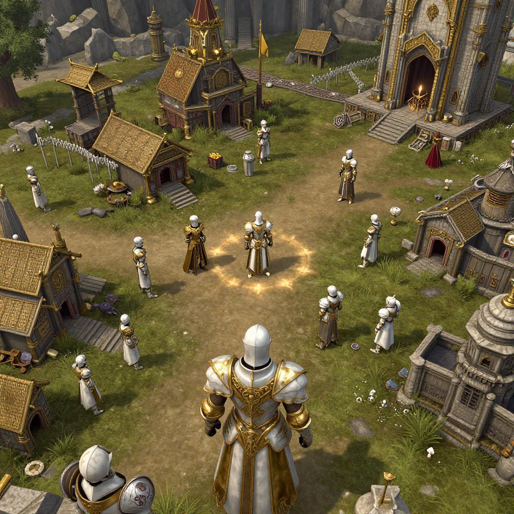 CGI fantasy scene: armored knight in gold armor stands in grassy village with stone buildings, robed figures, and ceremonial fire. Medieval, mystical