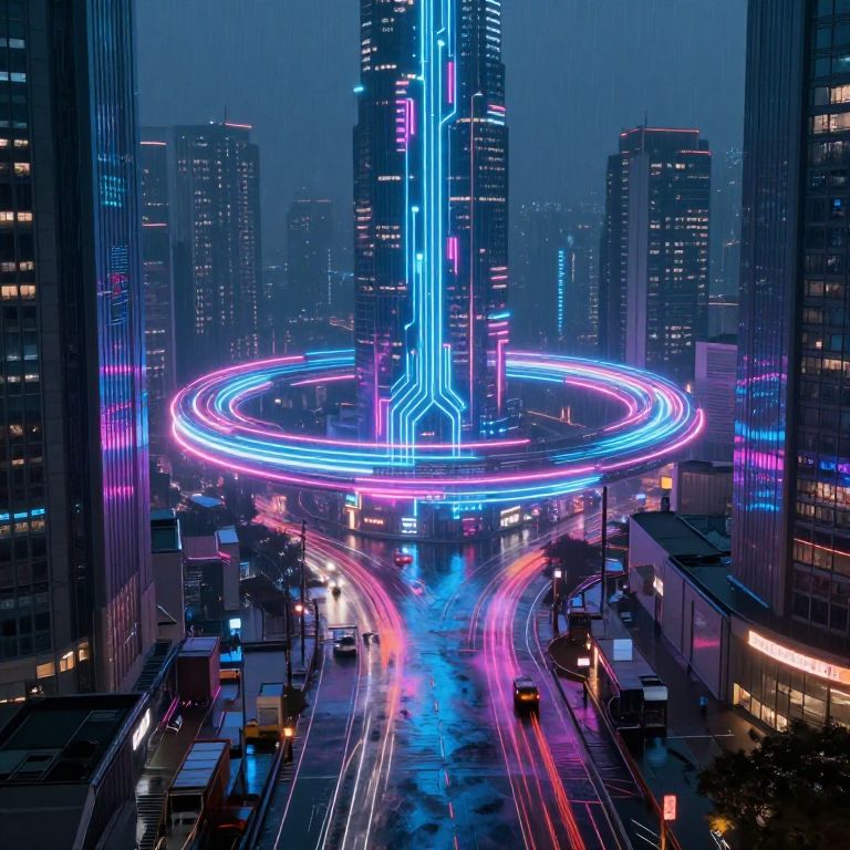 Loopback in a futuristic cityscape, glowing neon circuits forming infinite loops around towering skyscrapers, cyberpunk aesthetics with rain-soaked streets reflecting vibrant light trails, ultra-detailed, cinematic atmosphere.