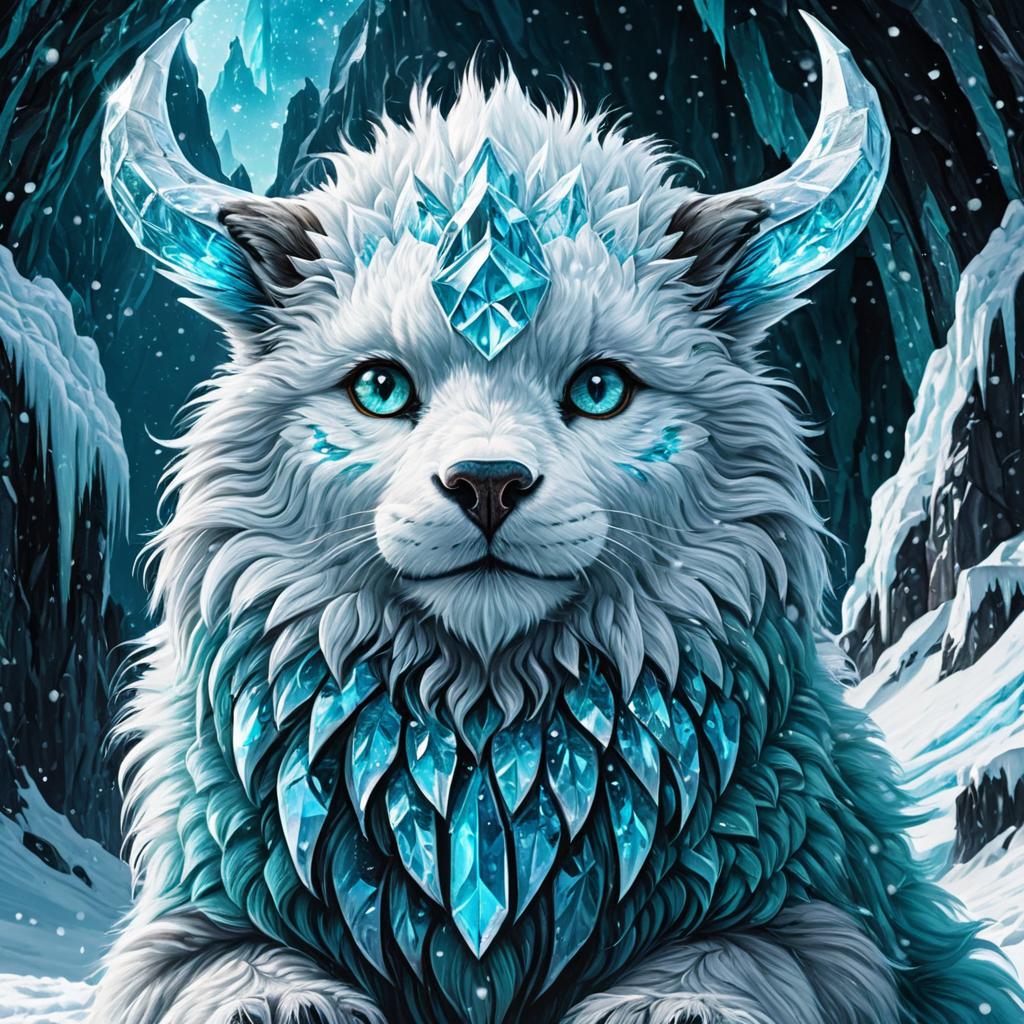 Digital artwork of an ice golem characterized by thick, fluffy white fur and large glacier teal eyes. The golem has crystalline ice horns and a detailed icy mane with embedded shimmering blue crystals. It stands in a frozen crystal cavern surrounded by snow-covered cliffs under a brilliant night sky. The image showcases vibrant colors, intricate fur details, and a glowing ice aura.