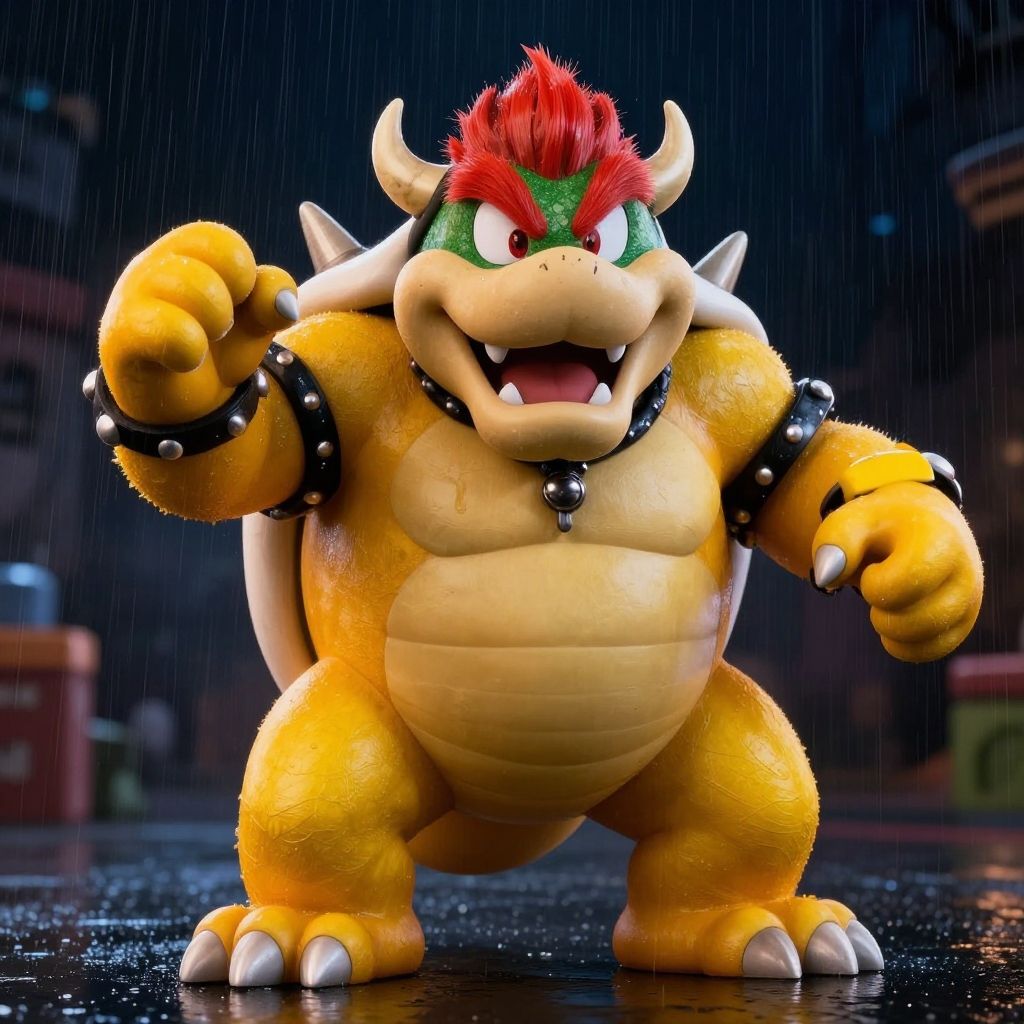 CGI image of Bowser from Mario series, standing in rain, fists raised, yellow-orange skin, green shell, red hair, black spiked bracelets