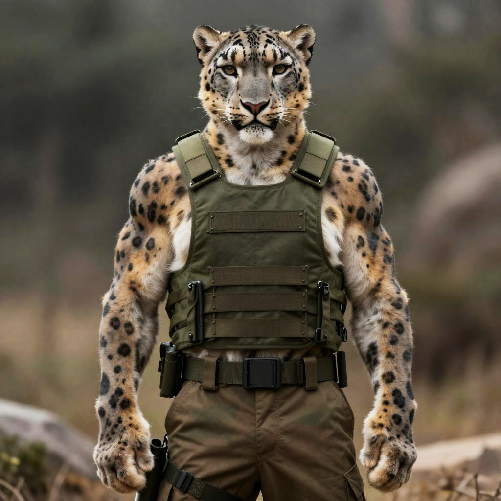 Anthropomorphic Muscular Snow Leopard in Military Gear