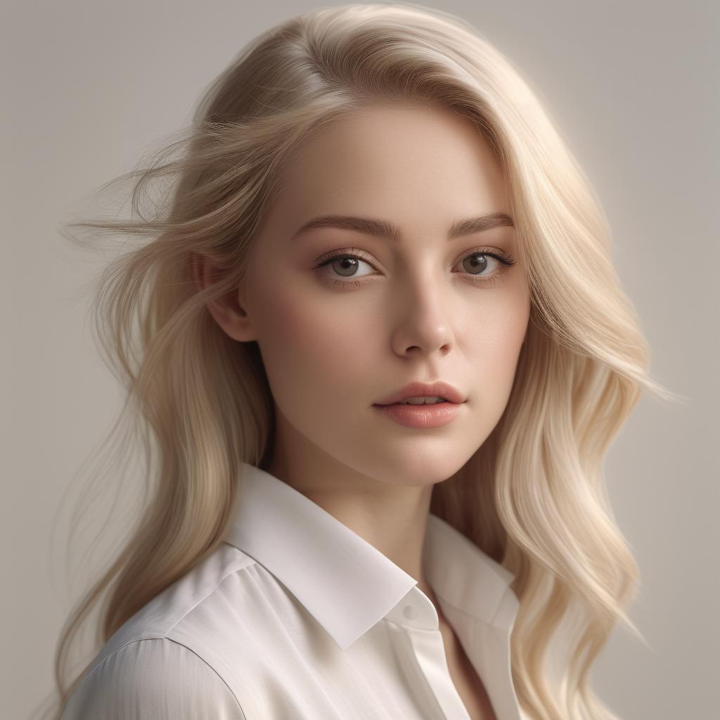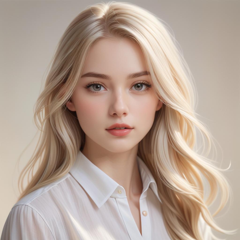 A photorealistic portrait of a young woman with long pastel blonde hair wearing a white shirt, soft natural light illuminating her delicate features, ethereal beauty with gentle expression, realistic skin texture and subtle shadows, soft beige and white color scheme, indoor setting with a neutral background