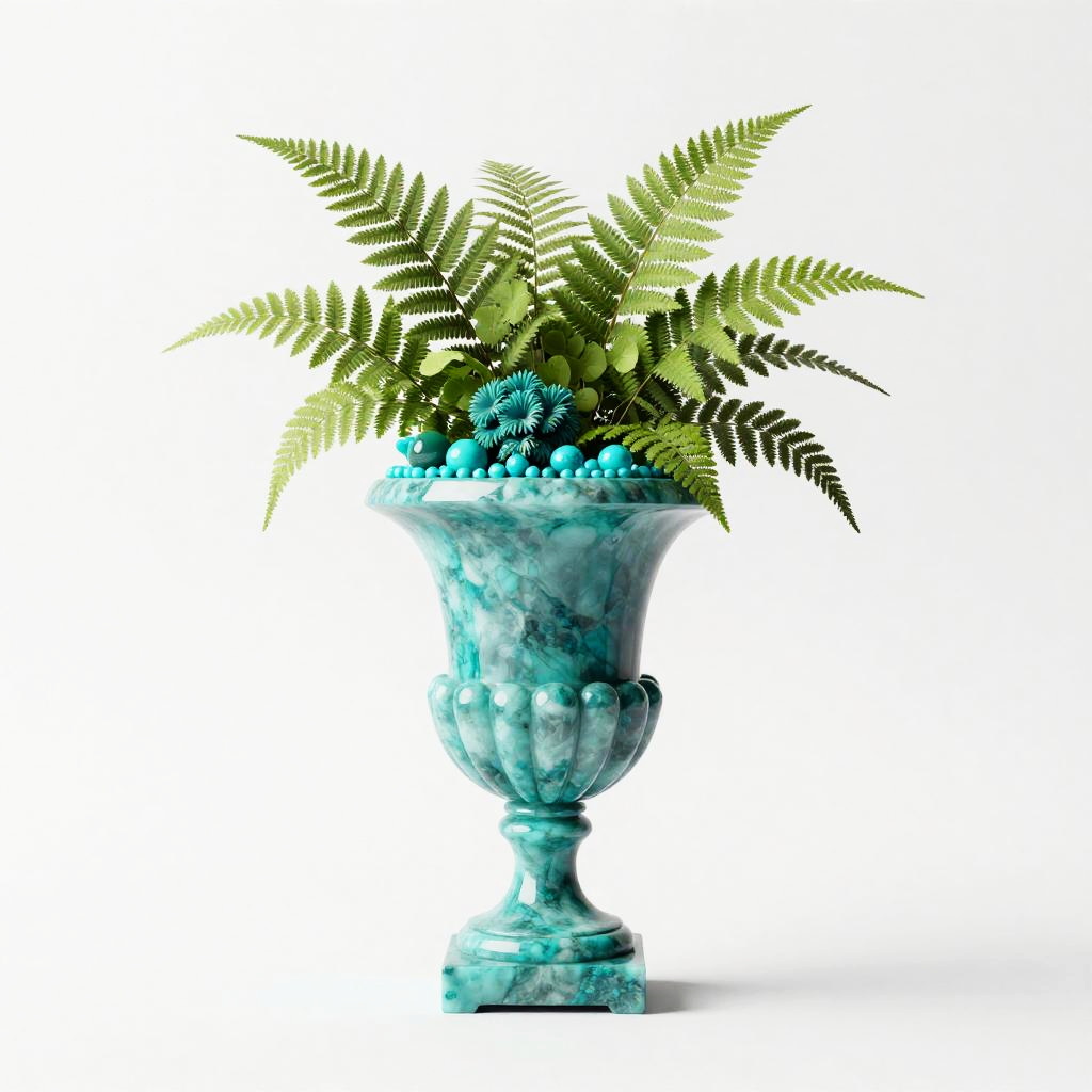 Photograph of a blue, marble-like urn with intricate detailing, filled with green ferns and blue spiky foliage. The urn, which has a classic, ornate design with a wide base and narrow top, stands upright against a plain white background. The blue hue of the urn contrasts with the green ferns and blue foliage, creating a vibrant, tropical arrangement. The ferns have delicate, feather-like leaves, while the blue foliage adds texture and depth to the bouquet. The photograph has a high-contrast, almost surreal quality, emphasizing the vivid colors and textures of the elements.
