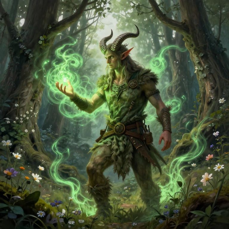 Tiefling druid male in a sacred grove at dawn, green energy swirling around, nature spirits manifesting, rustic outfit made from natural fibers, elaborate horn patterns, surrounded by ancient trees and blooming flowers, painterly fantasy art style, soft light