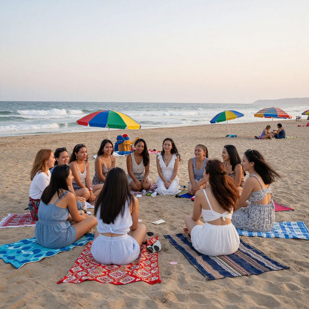 A crowd of women gathered on a serene beach at sunset, casual summer outfits fluttering in the breeze, colorful umbrellas and blankets around, waves gently crashing in the background, evoking a sense of friendship, freedom, and joy.