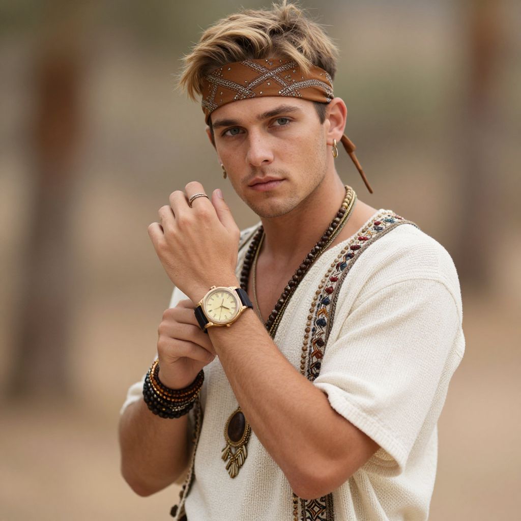 Photograph of a young, white man with light brown, tousled hair, wearing a brown, jeweled headband and a white, textured tunic with black, patterned trim. He has a gold wristwatch on his left wrist and multiple black bracelets on his right. His blue eyes look slightly to the left, and his expression is neutral. He is slightly tanned, with a slender, fit physique. The blurred background features tall, brown tree trunks in a sandy, outdoor setting. His right hand is raised, fingers intertwined, and he wears a simple gold ring. The overall style is bohemian or hippie-inspired.