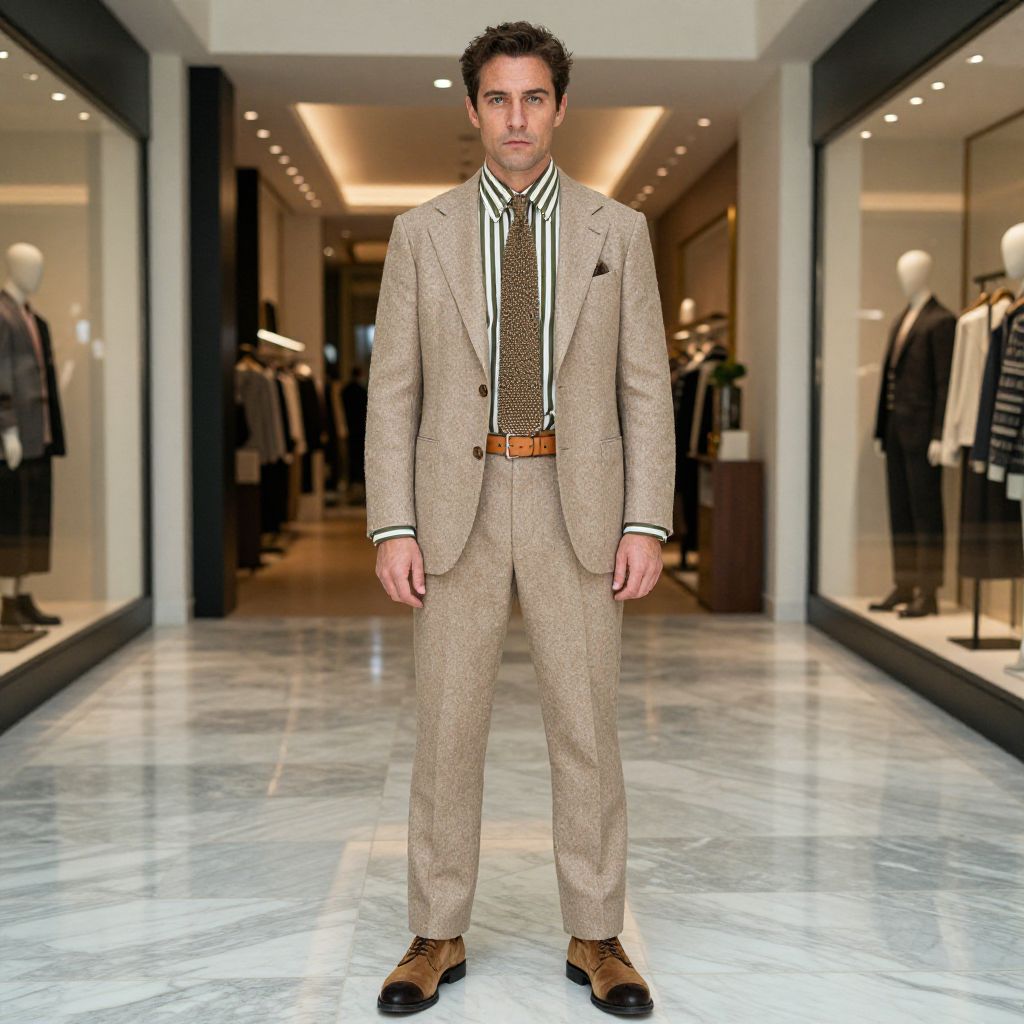 Photograph of a tall, handsome man with short, dark hair and fair skin, standing in a modern, well-lit shopping mall. He wears a beige, tweed three-piece suit with black and white vertical striped shirt, brown leather belt, and brown brogue shoes. The background features large glass display windows showing mannequins in suits, and a glossy, marble-like floor. The man's confident stance and direct gaze enhance the sophisticated, stylish atmosphere. The lighting highlights his outfit and the sleek, polished environment.