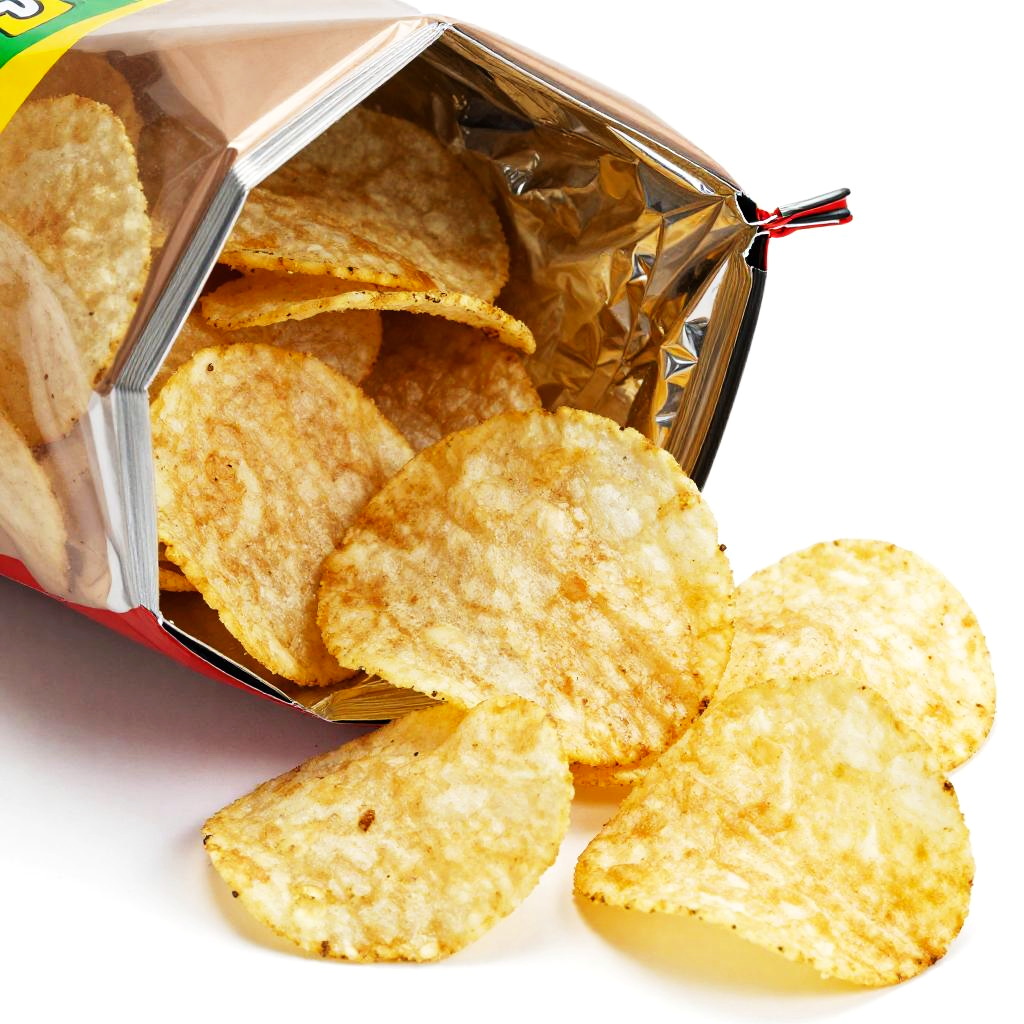 Close-up shot of hands holding a clear chip bag, mid-action of opening it, focusing on the plastic’s crinkled detail and golden chips visible through the packaging