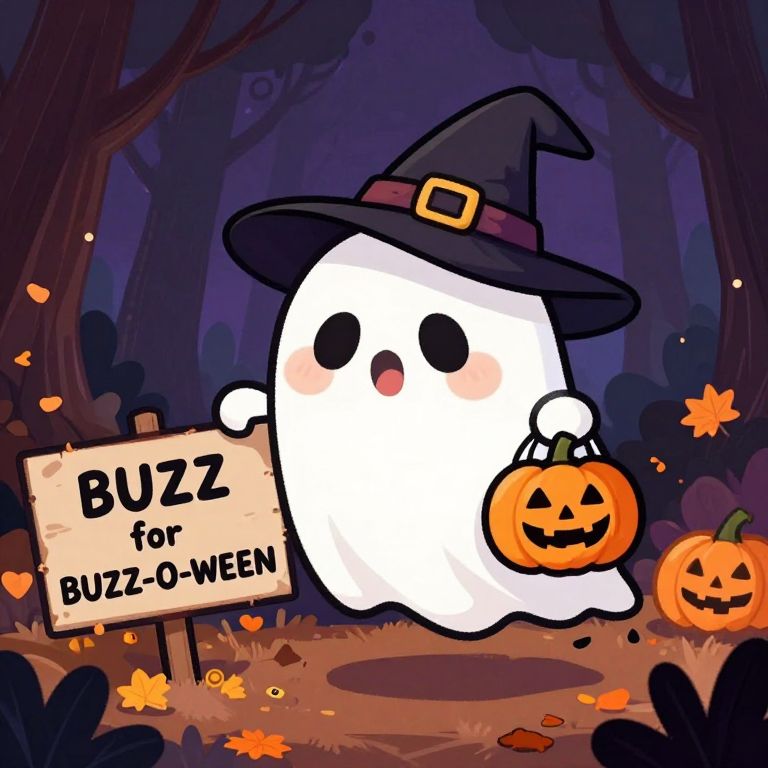 Close up cinematic photo, a cute zombie girl, happy facial expression, holding a pumpkin shaped bucket with a sign on it saying ''Put Buzz In The Bucket! Please!'', thumbs up, night time, woods, illustration, clear