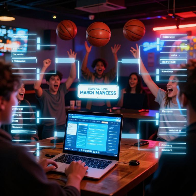 Dynamic march madness bracket fundraiser online scene featuring glowing brackets on laptop screens, enthusiastic participants cheering, basketballs flying, lively sports bar background