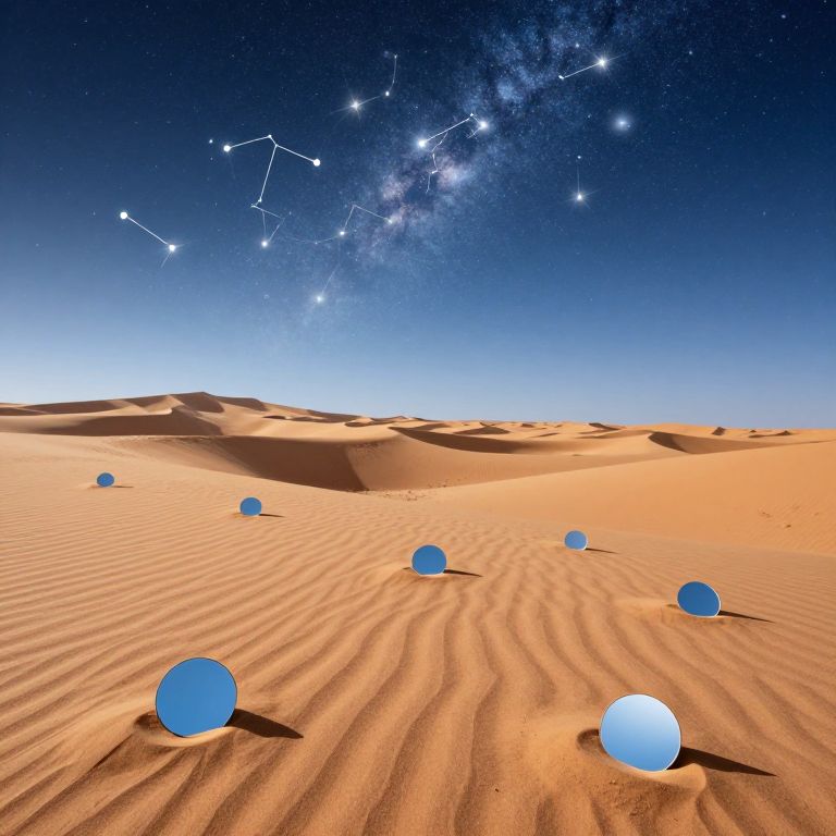 A desert where every grain of sand is a tiny mirror reflects a kaleidoscopic sky of reversed constellations, inhabited by ghostly astronomers grounded by their own stardust.