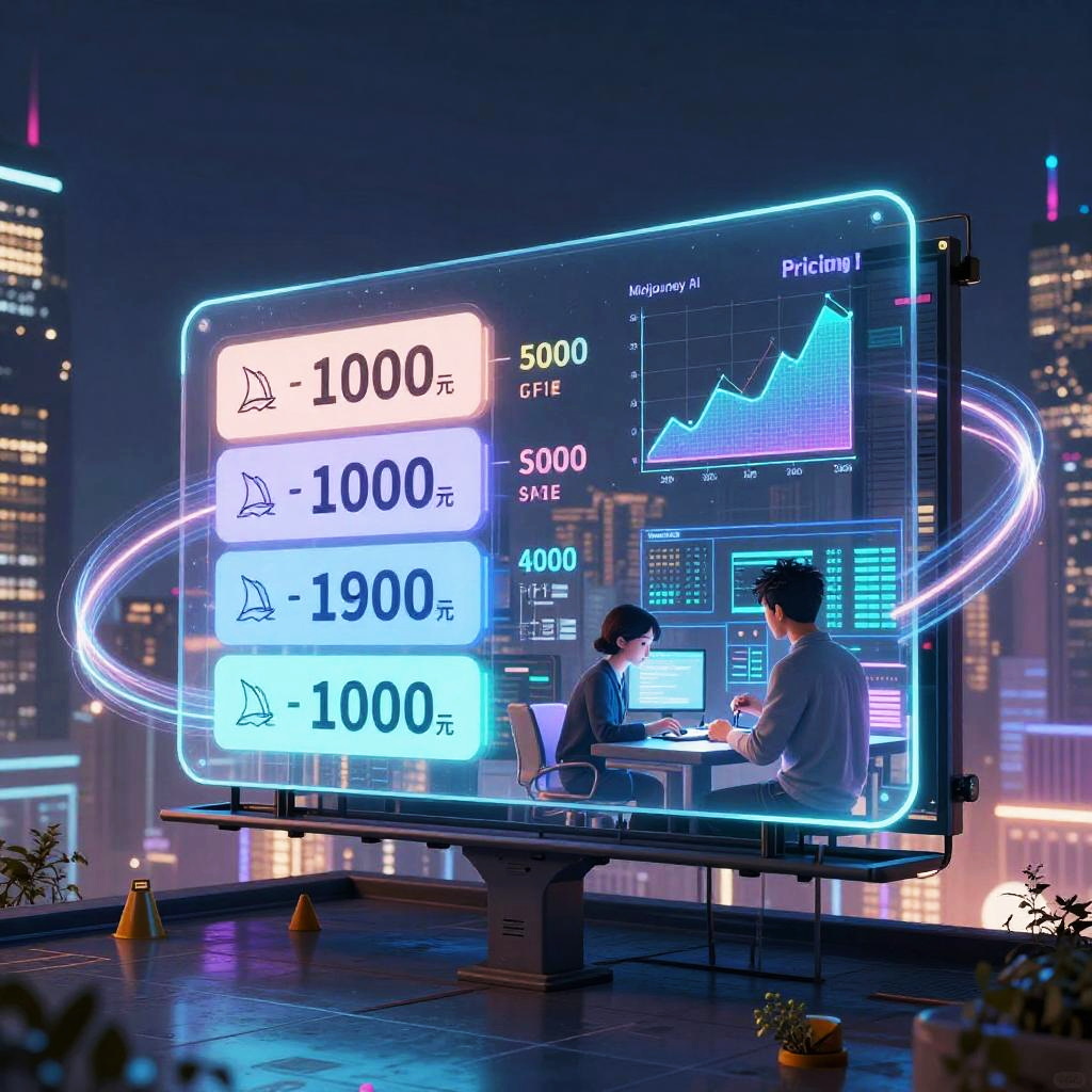 Midjourney AI pricing represented by a conceptual billboard in a neon-lit futuristic city, displaying transparent floating panels with pricing tiers, AI avatars analyzing data, and glowing graphs swirling around in a dynamic composition.
