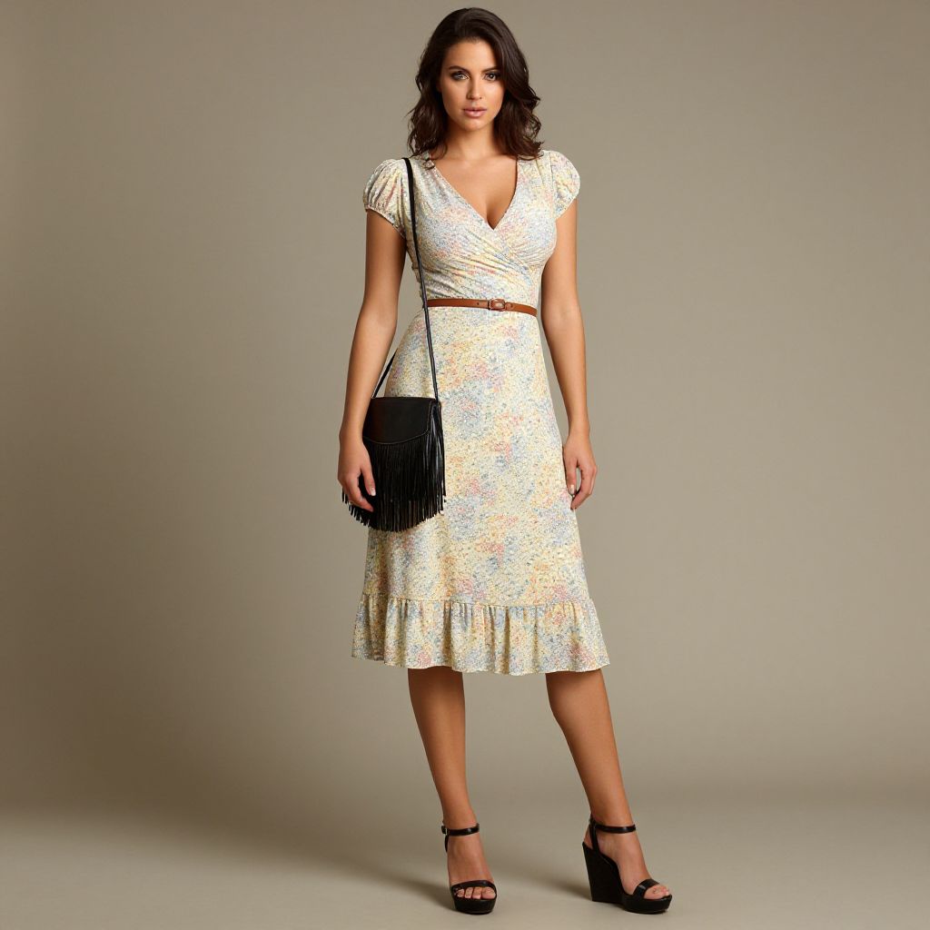 "Woman, vintage-inspired, floral print midi dress in pastel tones, V-neckline, short puff sleeves, fitted waist with thin brown leather belt, A-line skirt with a ruffled hem, black leather crossbody bag with fringe, black open-toe wedge sandals, neutral studio background. Sexy. Pretty face and beаutiful eyes. Big breasts."