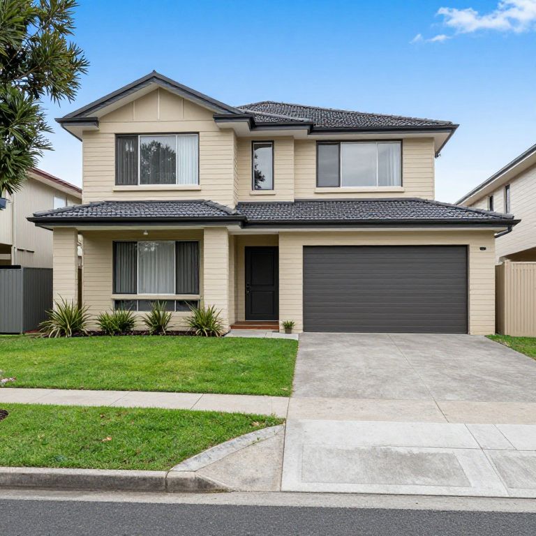 Photograph of a modern, two-story, beige stucco house with a black shingle roof and dark grey garage doors. The front features a black front door, large rectangular windows with white blinds, and a concrete driveway leading to the garage. The well-maintained lawn has green grass and small, spiky plants near the house. A sidewalk runs parallel to the driveway, and a neighboring house is partially visible on the left. The sky is bright blue with a few clouds.