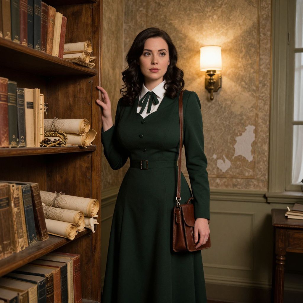 Portrait of a woman dressed as a library archivist in a long dark green dress with white collar and bow, carrying a small brown leather satchel. She stands next to a wooden bookshelf filled with ancient scrolls and old books in a vintage university library with peeling wallpaper and warm ambient lighting.