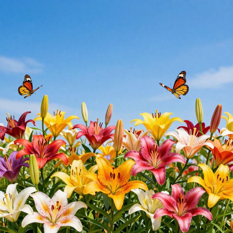 Lily's vibrant meadow filled with multicolored lilies under a bright blue sky, butterflies fluttering around, lively and joyful mood, photorealistic style emphasizing texture and natural beauty
