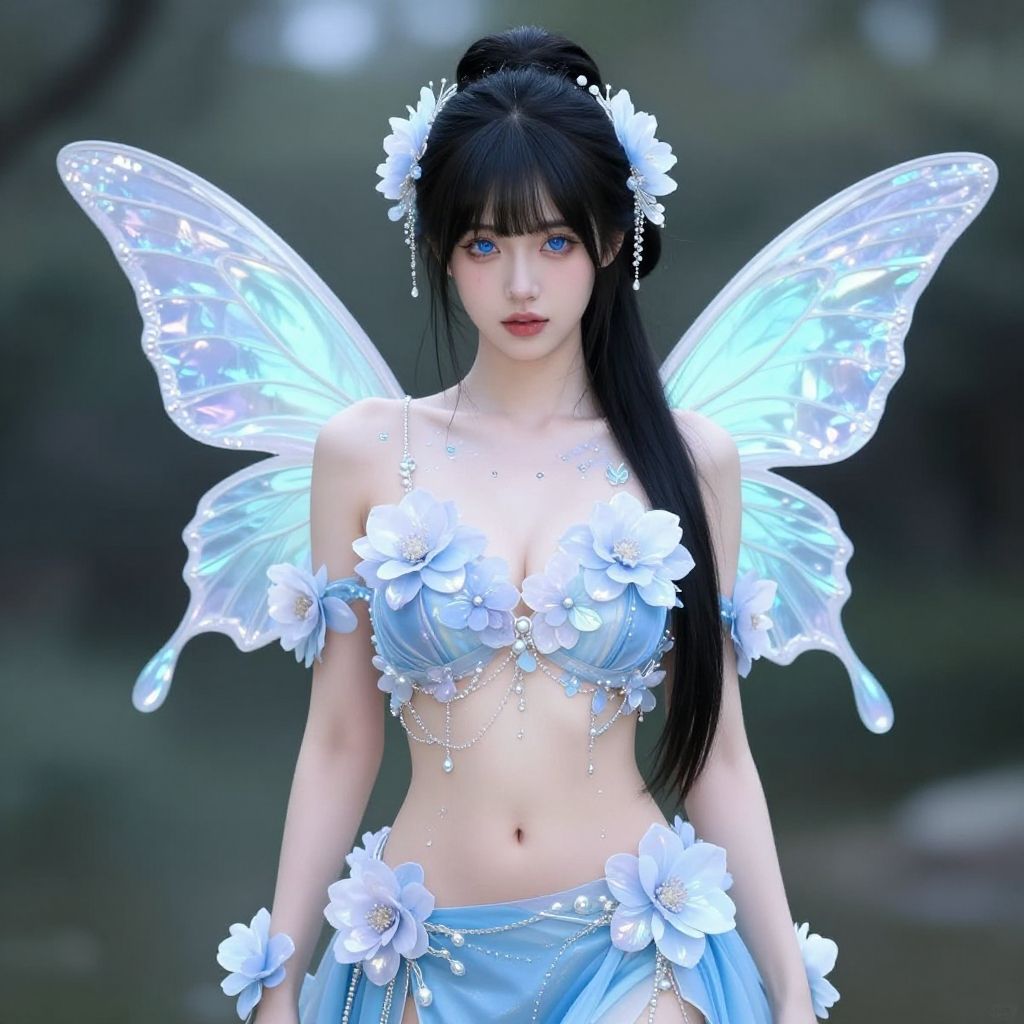Score_9, score_8_up, score_7_up, score_6_up, score_5_up, witchyaesthetic, realistic, blurry background witchyset33, 1girl, solo, long hair, breasts, looking at viewer, bangs, blue eyes, skirt, black hair, hair ornament, navel, cleavage, bare shoulders, medium breasts, standing, ponytail, flower, detached sleeves, wings, midriff, lips, blue skirt, clothing cutout, cleavage cutout, high ponytail, fairy wings, butterfly wings, iridescent, gradients, pearlescent, flowers, body paint