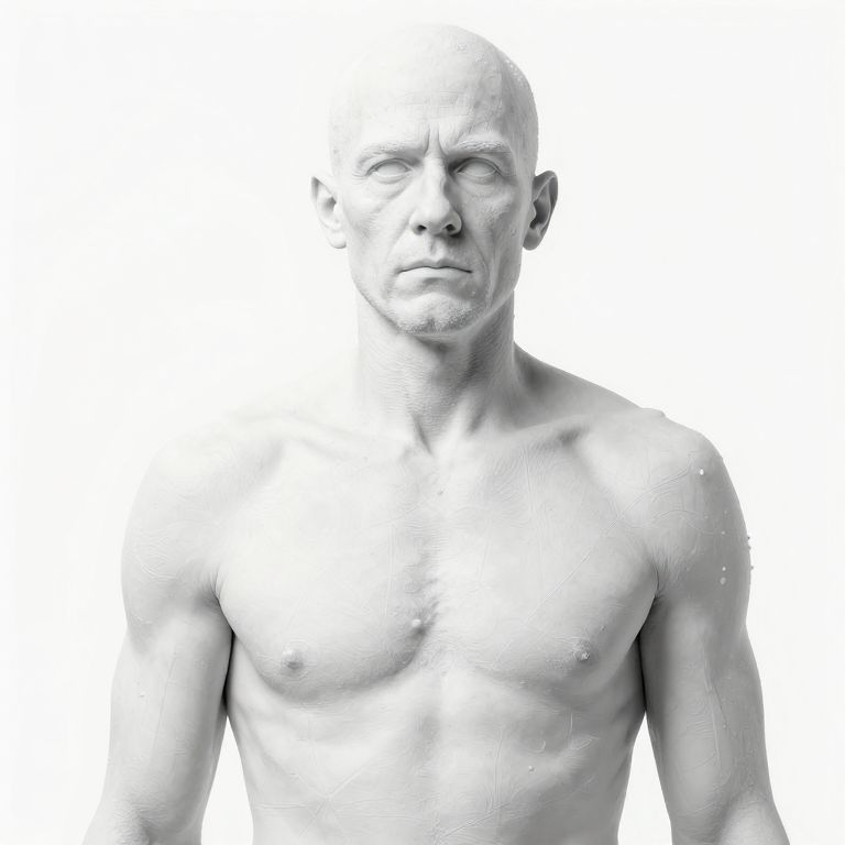 High-contrast black-and-white photograph of a bald, muscular, shirtless man with water droplets on his chest, gazing upward against a white