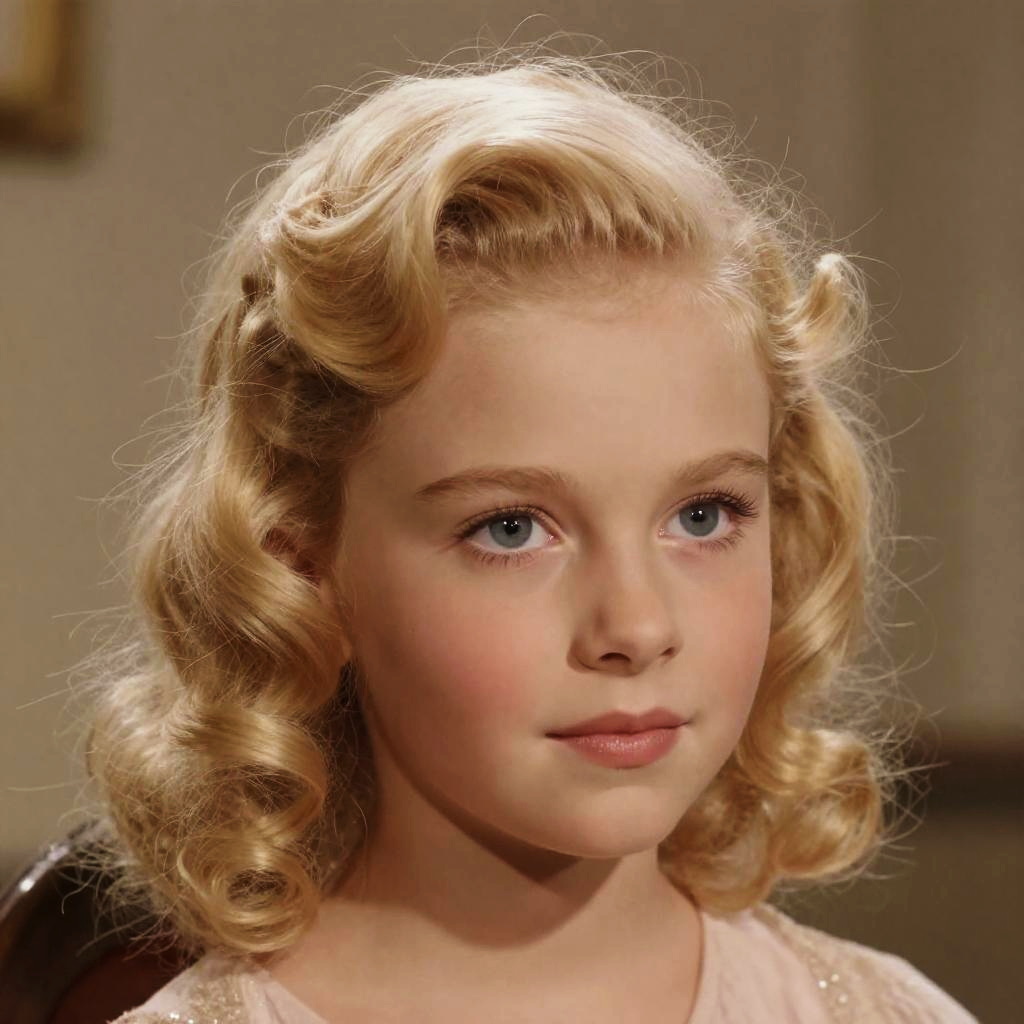 Shirley Temple hair color in vibrant golden blonde locks, classic child star curls, soft vintage lighting creating warm highlights, detailed textured hair strands, peaceful expression on a delicate face, subtle 1930s glamour vibe with soft background blur