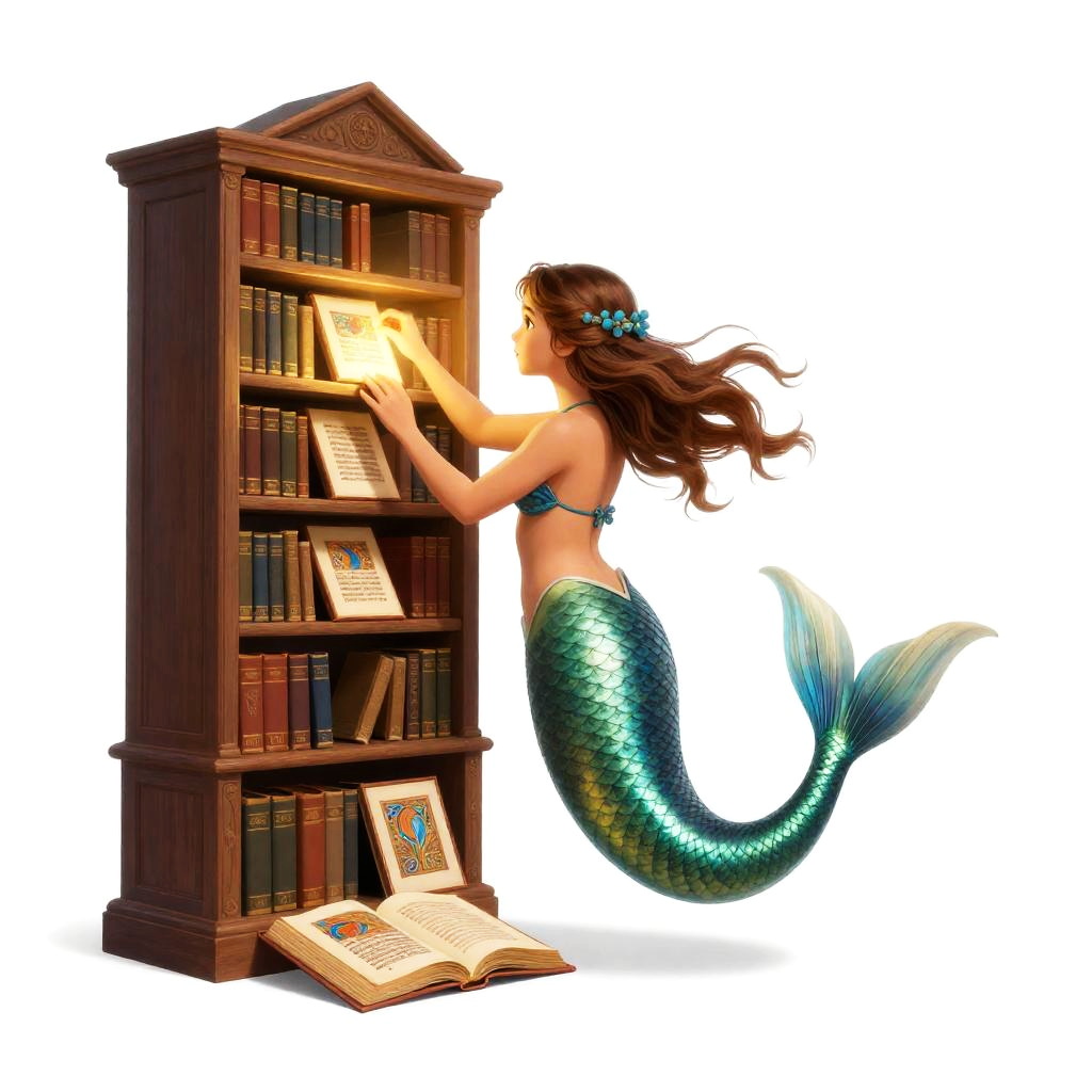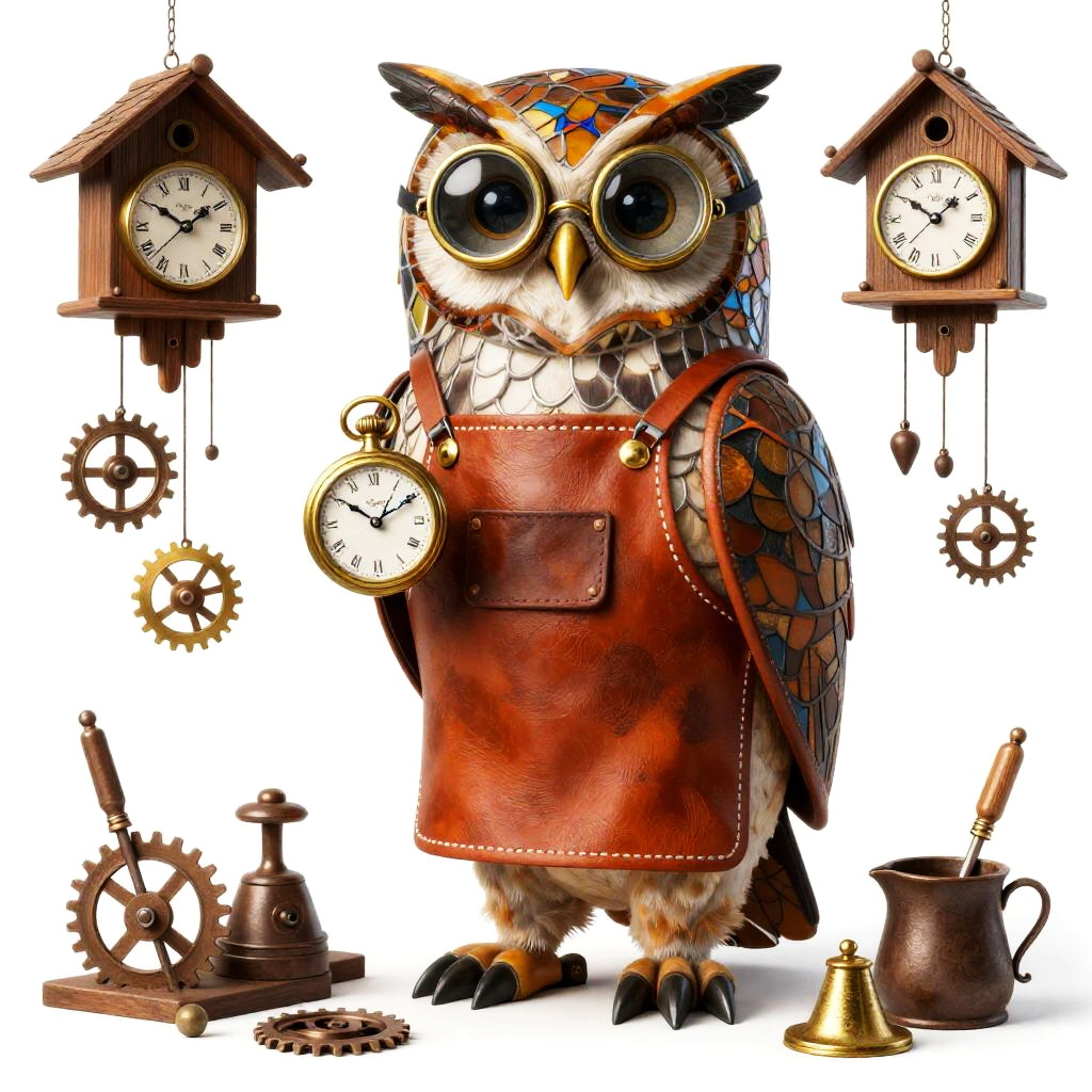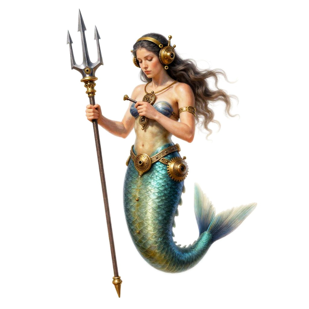 Merfolk mechanic in steampunk gear repairing a steam-powered trident, high detail, full body illustration, featuring retro-futuristic gouache art, set against a stark white backdrop.