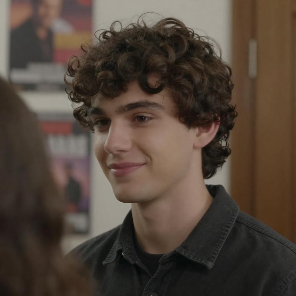 Photograph of a young man with curly brown hair and light skin, wearing a dark shirt with a white collar and a silver necklace. He has a serious expression. Background includes blurred musical instruments, including a saxophone on the right. Multiple people in the background. Warm, indoor lighting.