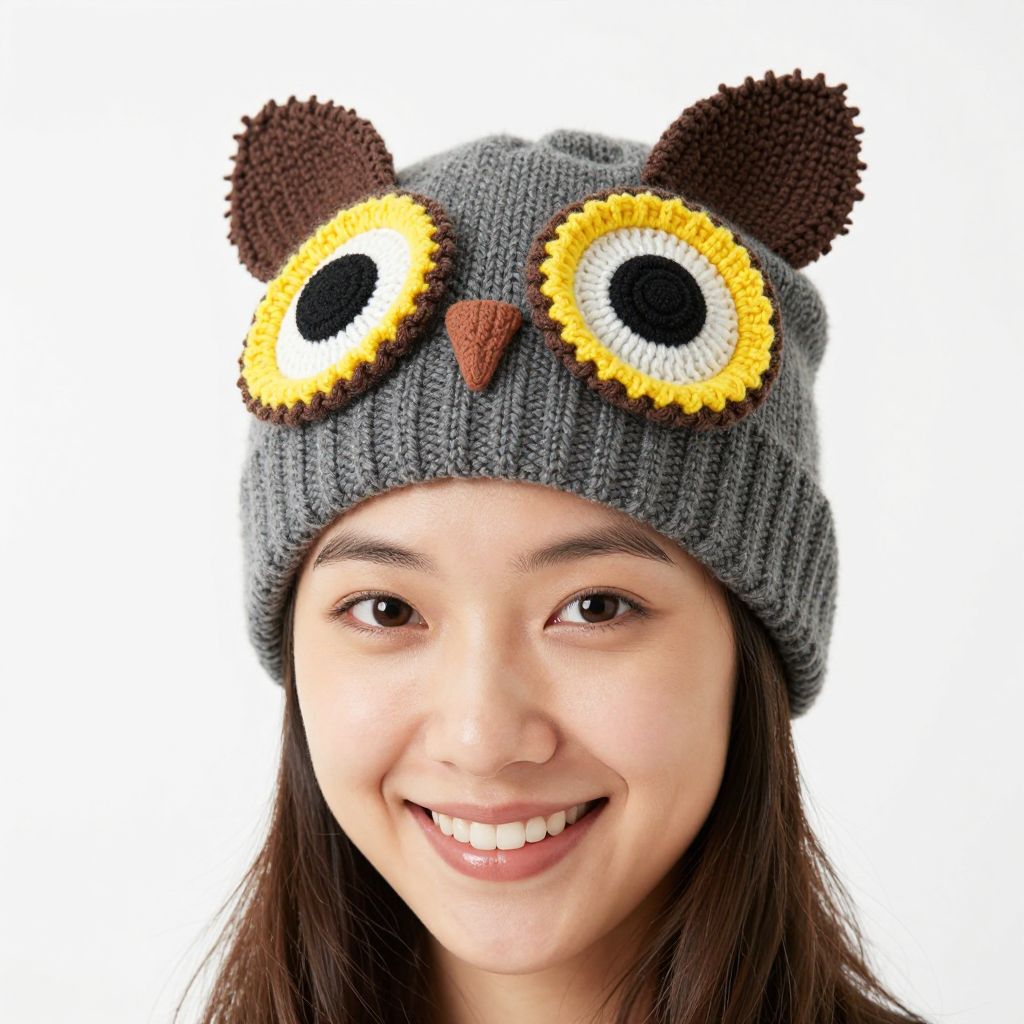Smiling woman wearing a whimsical gray knit cap featuring two large, round owl eyes with yellow outlines and black pupils, complemented by brown knitted ear-like accents on top, set against a plain white background.