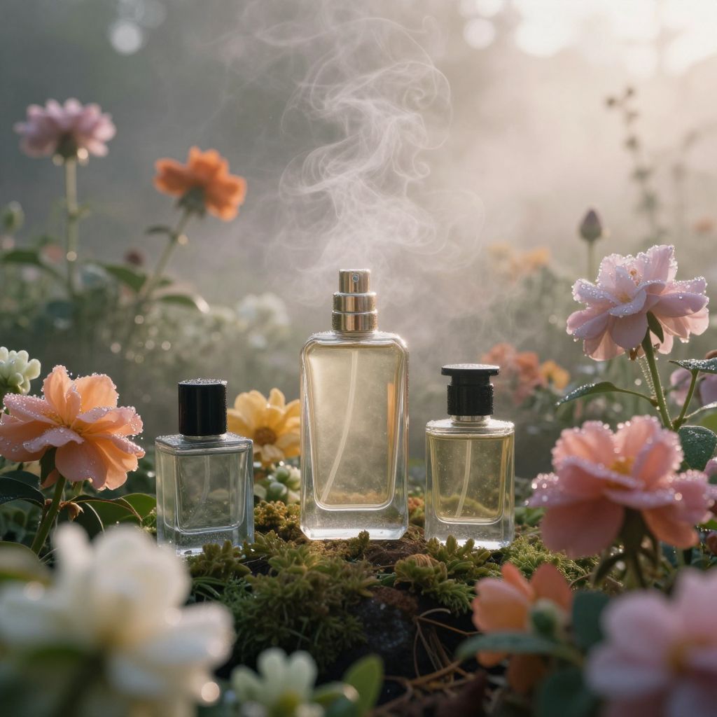 Fragrances captured as ethereal mist swirling in a lush botanical garden at dawn, sunlight filtering through dew-covered petals, vibrant colors blending with soft pastel tones, a dreamy and elegant atmosphere, hyper-realistic, cinematic lighting.