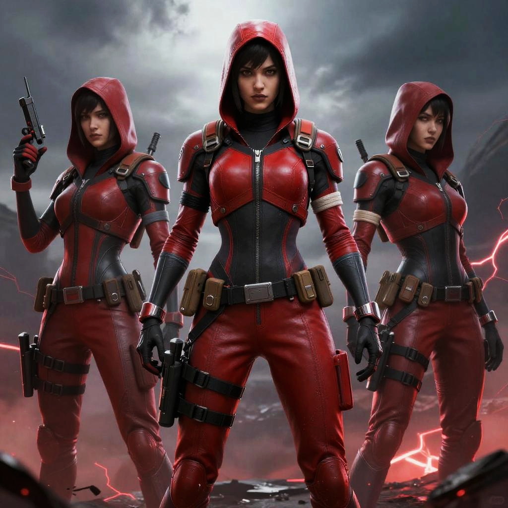 Red Fortnite skins girl exploring a dystopian wasteland, rugged red armor with battle scars and glowing highlights, holding a futuristic crossbow, dramatic stormy sky with flashes of lightning, gritty and vivid color palette emphasizing resilience and determination.