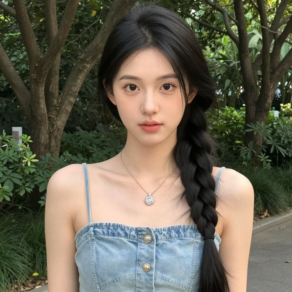 A delicate woman in her early 20s with a soft smile and straight black hair sits on a wooden bench in a countryside park, wearing a lightweight floral shirt with a delicate waist cut-out, the setting bathed in golden afternoon sunlight with trees and a nearby lake providing a peaceful, natural backdrop.