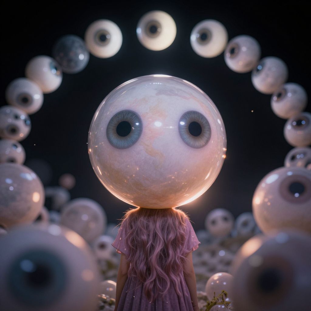 Model a photo of weirdcore, dreamcore, eyes, spheres, bubbles, multiple moons, pulled back photograph, wide angle, magical, rim lighting, bokeh, oddity, dreamlike, whimsical,