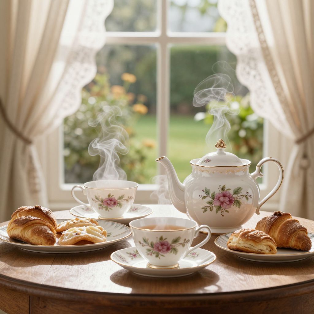 Tea time scene with elegant vintage teapot and delicate porcelain cups steaming on a wooden table, soft morning light filtering through lace curtains, cozy atmosphere with fresh pastries and a lush garden visible through the window