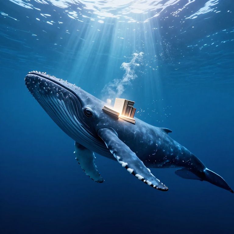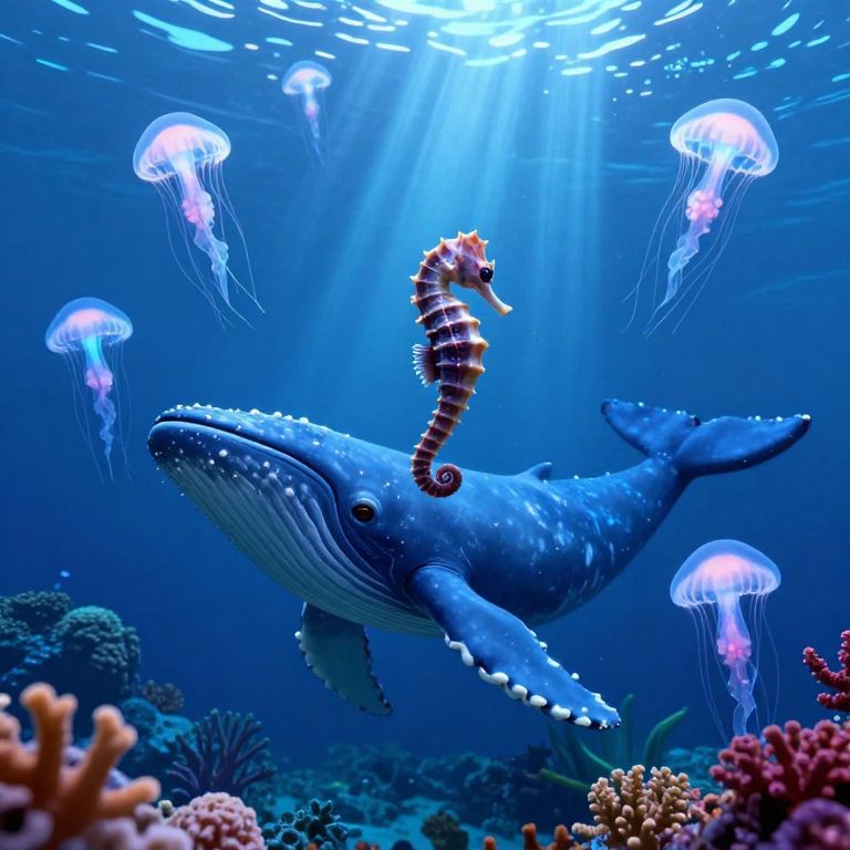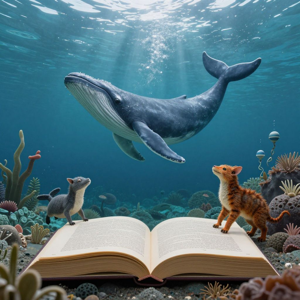 Photograph of an underwater scene featuring a large blue whale swimming above an open book on the ocean floor. Two small, colorful sea creatures, one grey with black stripes and the other orange with brown spots, stand on the book. The background shows a variety of coral, sea anemones, and underwater plants. Sunlight filters through the water, creating a serene atmosphere. The whale's massive size contrasts with the tiny book and creatures, emphasizing the fantastical nature of the scene.