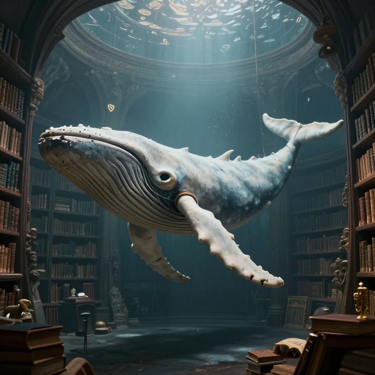 Where imagination meets the ocean, a whimsical archipelago of books transforms into living symbols of their stories—whales glide beneath the waves, while mythical creatures emerge from the pages, embodying the eternal dance between freedom and the boundless depths of human creativity.