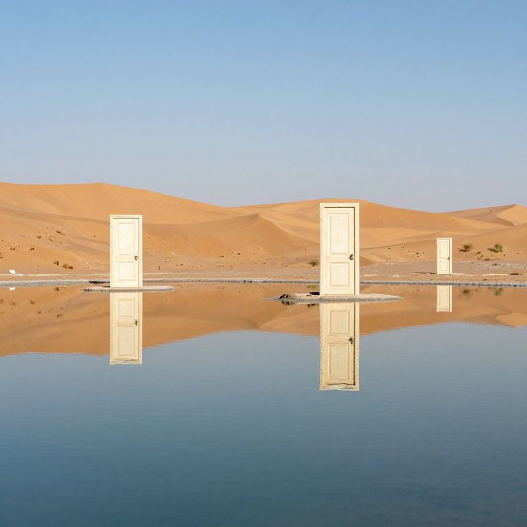 A desert lake reflects not the sky above, but doorways to other lands—each ripple shifting the reflection to a different dimension unknowingly.