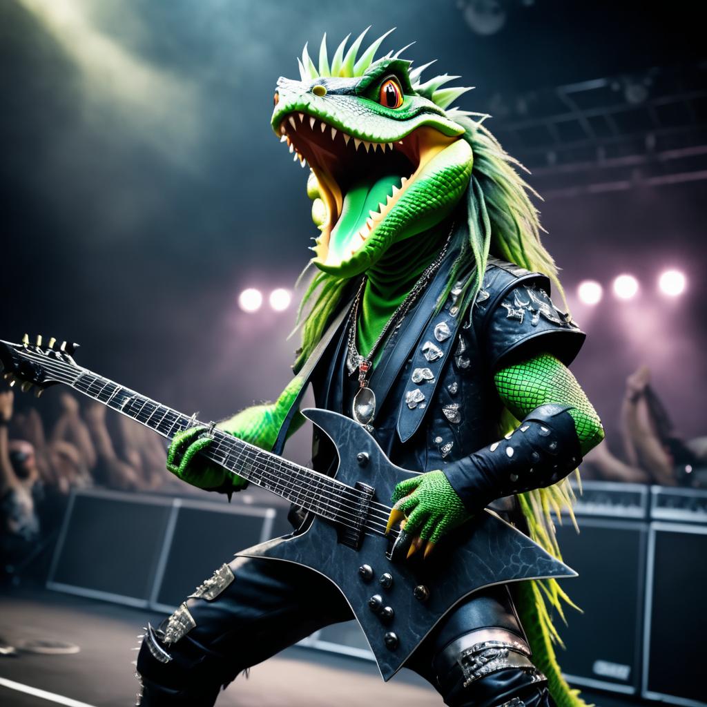 Anthropomorphic lizard dressed as a heavy metal rock star, playing guitar on stage before a headbanging crowd, dark and photorealistic.
